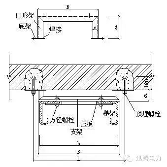 (6)电缆引下点位置及引下方式,一般而言,大批电缆引下可用垂直弯接板和垂直引上架,少量电缆引下可用导板或引管,注明引下方式即可。