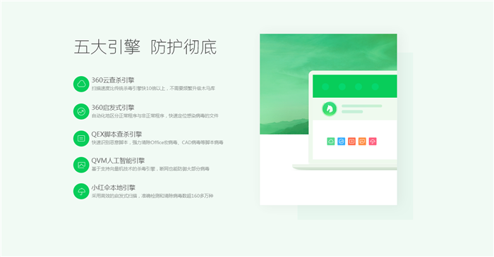 五大引擎,云查杀、启动式、QEX脚本、QVM人工智能、小红伞引擎。