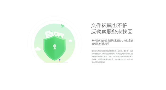 反勒索服务,首家防御此类木马病毒,如果不幸遭遇此类木马,360将帮您支付比特币,并全力恢复加密文档。